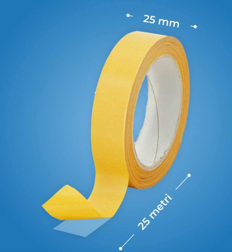 Transparent double-sided tape roll with a height of 25 mm and a total length of 25 metres.