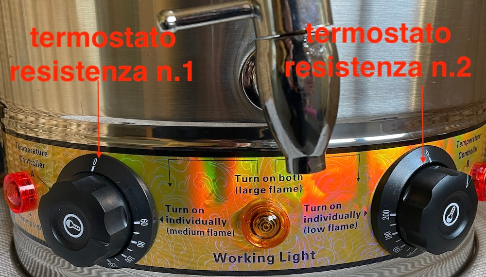 Il y a deux thermostats qui allument deux éléments chauffants distincts et vous permettent de régler la température souhaitée (il est recommandé de ne pas dépasser 100-110 °C) ; initialement, il est recommandé d'utiliser un seul élément chauffant et de régler le thermostat sur des températures basses de 30-40 °C jusqu'à ce qu'une couche de cire fondue de 4 à 5 cm se soit formée.